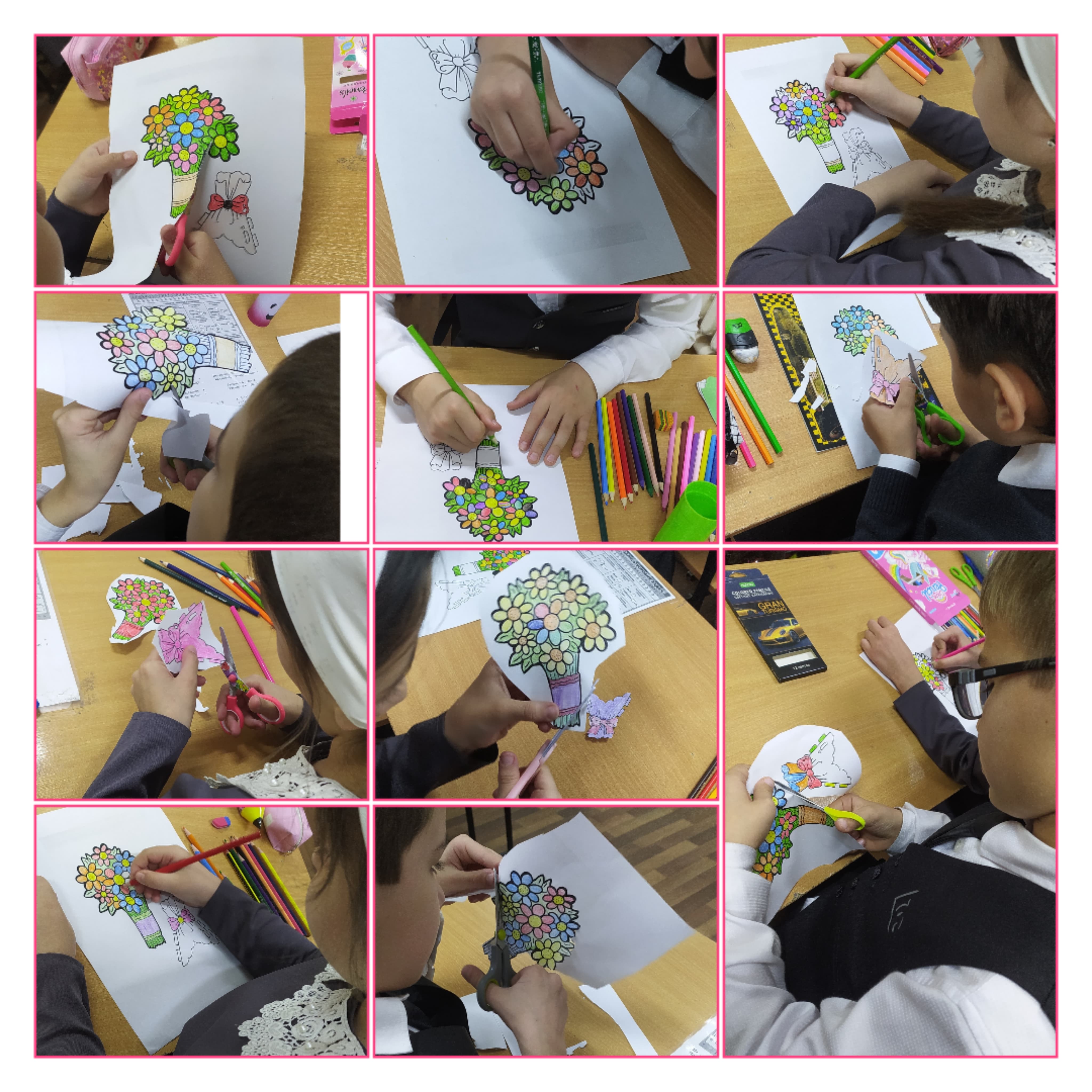 - Ученики начали с вырезания разноцветных цветочков из бумаги.