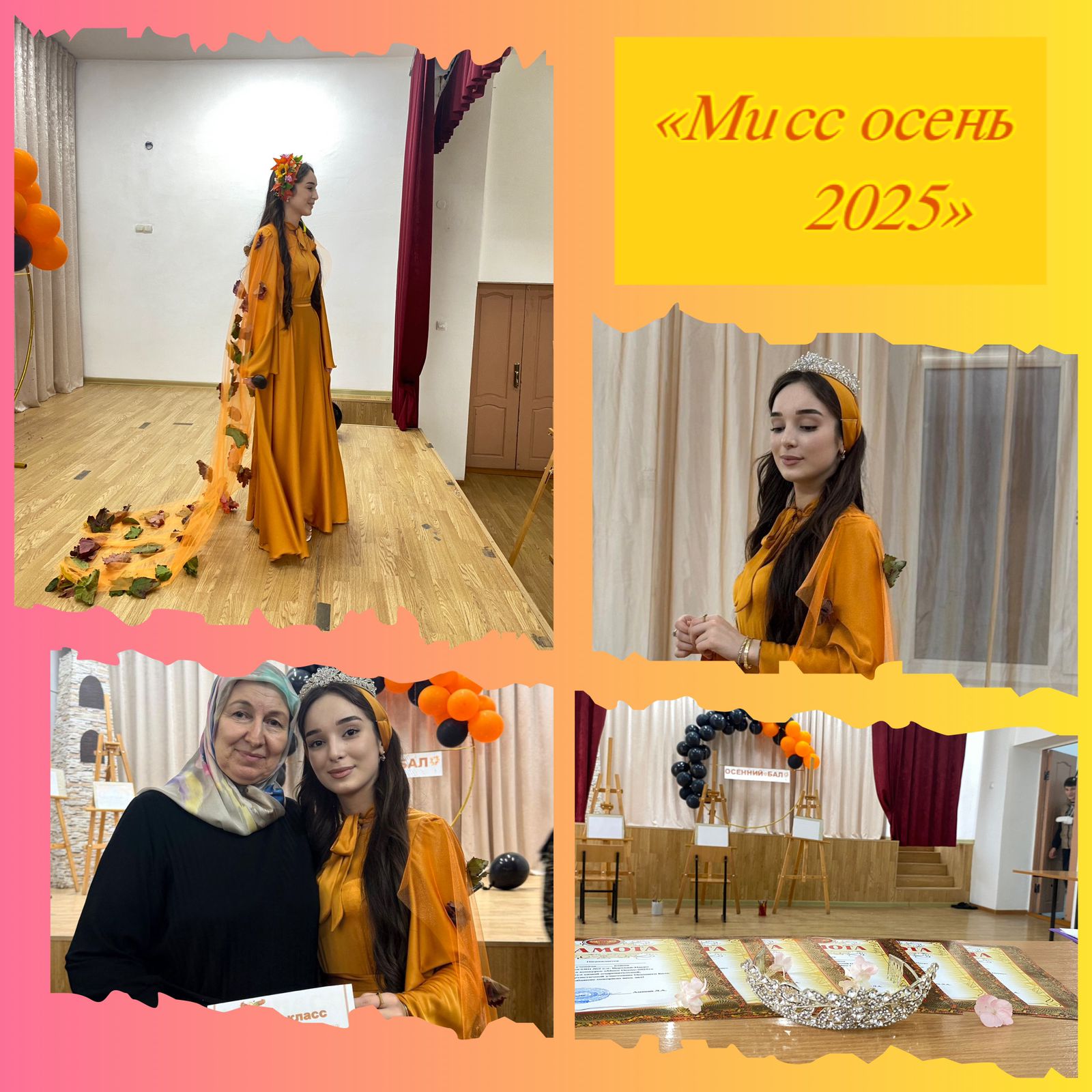 И, наконец, настал самый волнительный момент бала — объявление главной победительницы. Титул «Мисс Осень-2025» по праву завоевала обучающаяся 11-го класса Махаева Диана. Ее природное обаяние, интеллект, уверенность на сцене и яркий осенний образ не оставили шансов конкуренткам. Диана стала настоящим украшением вечера и продемонстрировала все качества, достойные королевы осеннего бала.